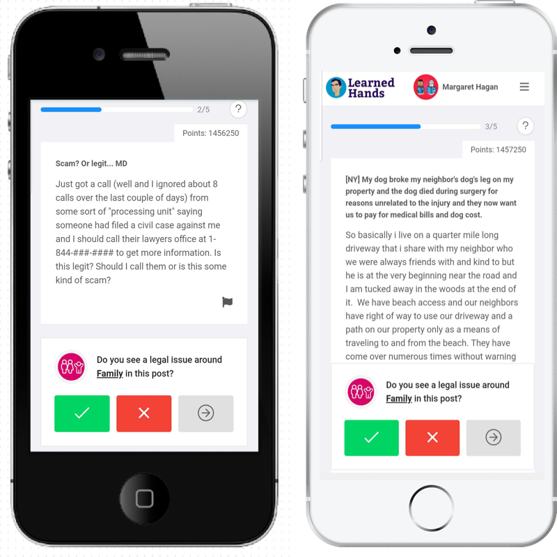 Learned Hands is a game in which you spot possible legal issues in real people’s stories about their problems. You read the stories, and then say whether you see a certain legal issue — family law issues, consumer law issues, criminal law issues, etc.