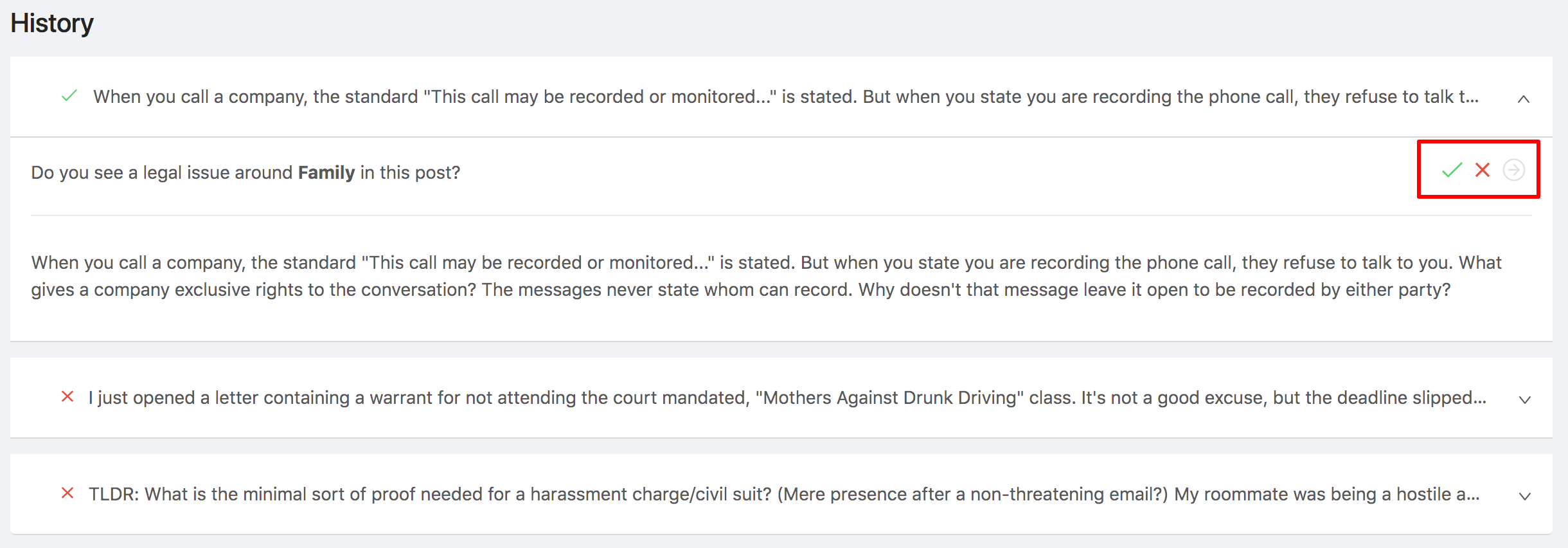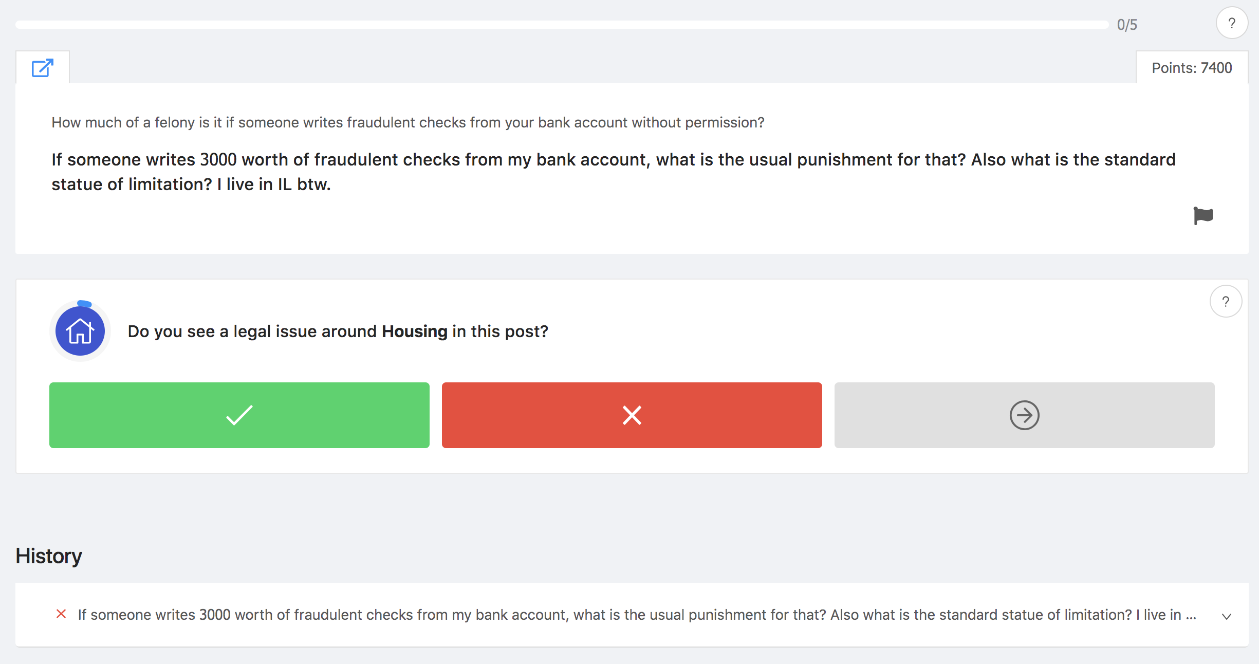 Once you choose your game type, then you can play! You’ll see a person’s post title and their story. Then you answer the question about whether an issue is present or not. Click the Green Check if you think this legal issue is present. For some posts, it might not be totally clear — but you can make the judgment call about whether you think this legal issue might be there.